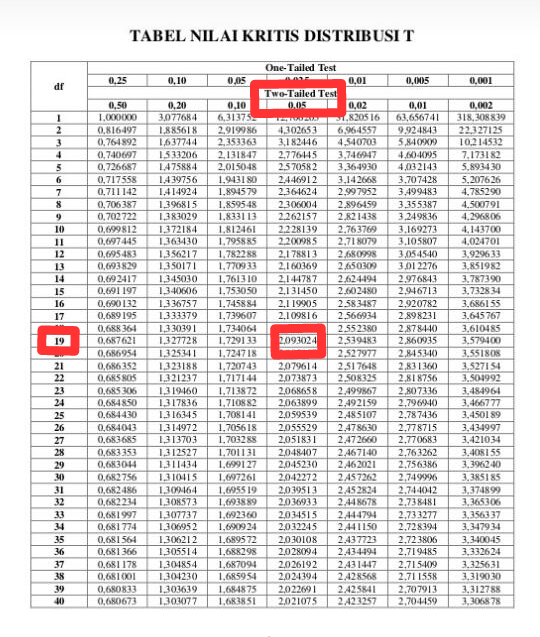 Sumber gambar : www.slideshare.net Ket.df = dk (derajat kebebasan)One-Tailed Test = Untuk uji satu fihakTwo-Tailed Test = Untuk uji dua fihakDalam membuat keputusan apakah hipotesis tersebut terbukti atau tidak. maka, bandingkanlah t hitung yang telah didapat sebelumnya dengan t tabel diatas. Untuk membaca t tabel, maka harus didasari dengan dk (derajat kebebasan), yang dimana n (Jumlah anggota sampel) - 1, sehingga dk nya 20 - 1 = 19. Disini ditetapkan taraf kesalahannya 5%. Setelah dilakukan pengujian dengan menggunakan uji dua fihak (Two-Tailed Test), ternyata t tabelnya ialah = 2,093